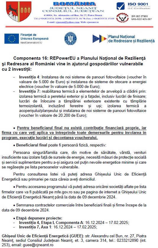 Prin Hotărârea  Consiliului Județean Neamț nr. 193/2024 a fost aprobată înființarea Ghișeului Unic de Eficiență Energetică (GUEE) având ca scop implementarea investițiilor I4: Schemă de granturi sub formă de bonuri valorice pentru accelerarea utilizării energiei din surse regenerabile de către gospodării şi I7: Schema de granturi sub formă de bonuri valorice pentru îmbunătățirea eficienței energetice a gospodăriilor din componenta 16: REPowerEU a Planului național de reziliență şi redresare al României.